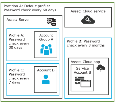 In the example below, Partition A has three profiles (Profile A, B, and C) and a default profile. Profile A checks passwords every 30 days. Profile B checks passwords every three months, and Profile C has the highest level of security, checking passwords every seven days. Note that the asset Server has two partition profiles each governing different accounts associated with the asset. Profiles A, B, and C are all explicitly assigned to the accounts and assets shown. Asset cloud service doesn't have an explicitly assigned profile so the default will be used to manage accounts on the asset.