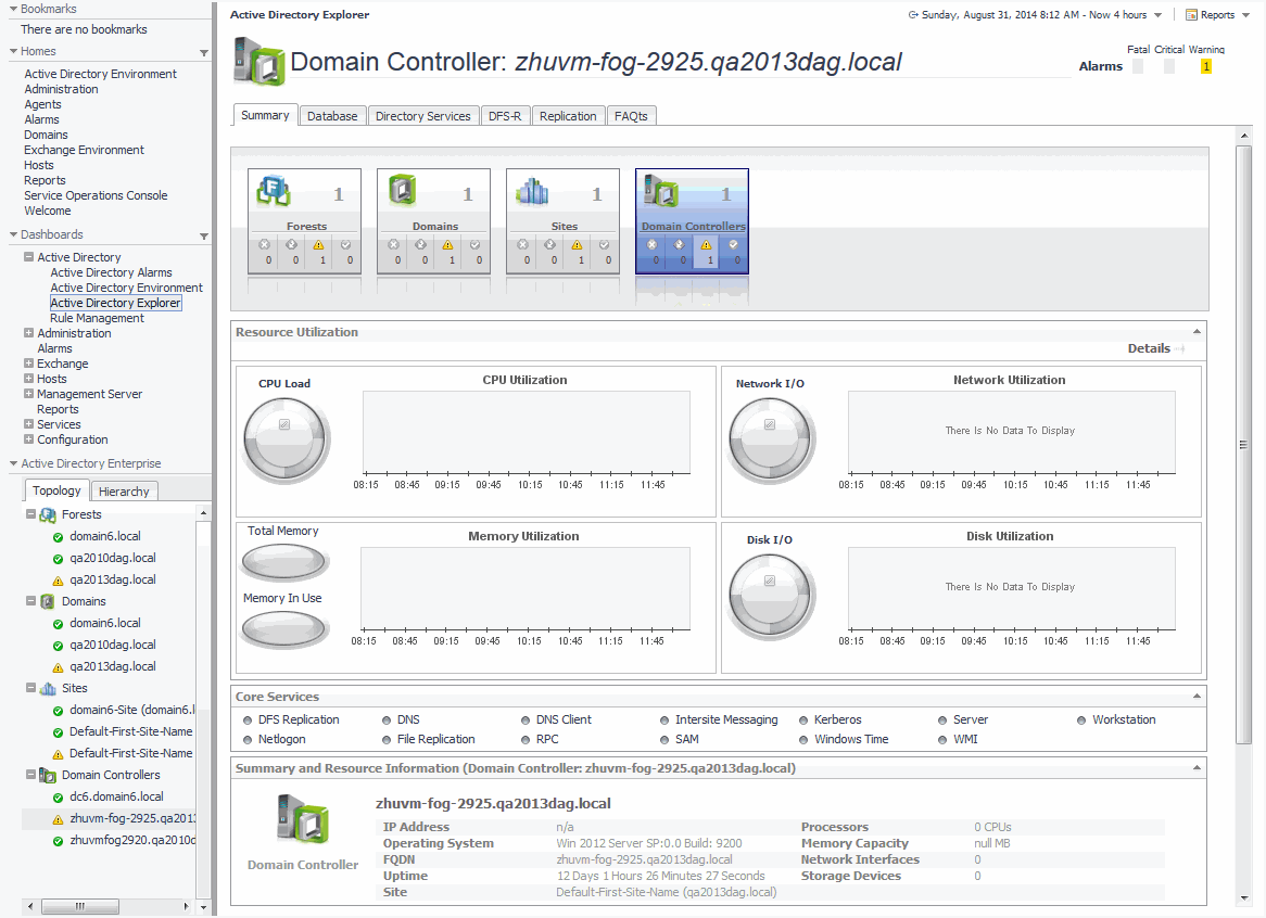 The Active Directory Explorer dashboard has a hierarchal interface that you can use to view various performance metrics and alarms within your Active Directory® infrastructure. It provides informative views through which you can quickly and easily access detailed information about any of the objects in your Active Directory environment.