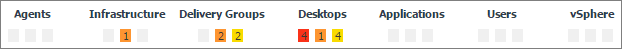 The top part of this dashboard shows the counts of alarms grouped by object type against which the alarms are generated: Agents, Infrastructure, Delivery Groups, Desktops, Applications, Users, and vSphere.