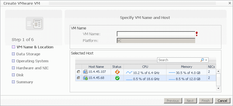 On the Specify VM Name and Host page, in the VM Name box, specify the name of the virtual machine that you are about to create. |