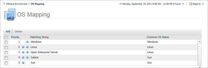 You configure OS mapping rules using the OS Mapping view. OS mapping is the mapping of the various versions and editions of a particular operating system to a common OS name. This helps Foglight for VMware manage the variety of versions and editions of each OS.