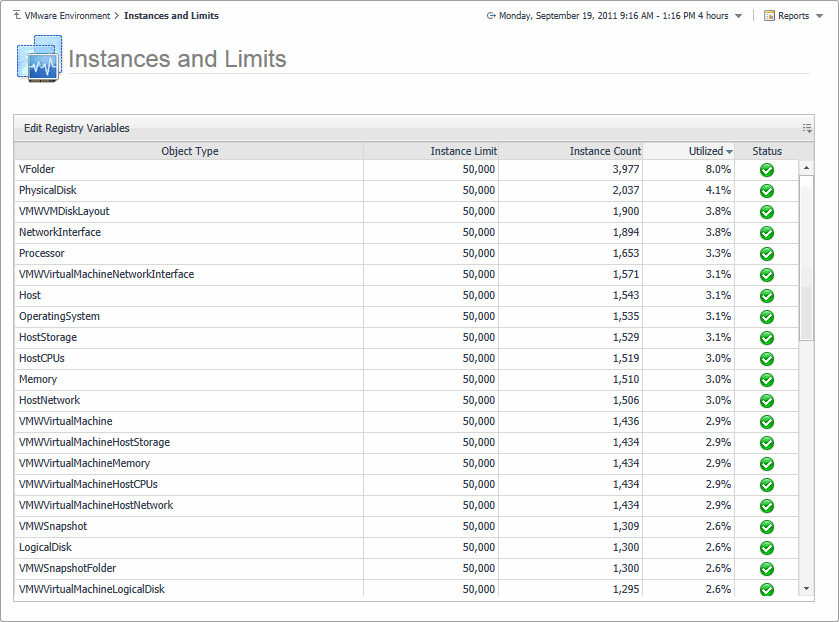 This view displays the list of the existing VMware object types. This information can give you insight into the size of your database and whether additional adjustments are required to improve your system performance.