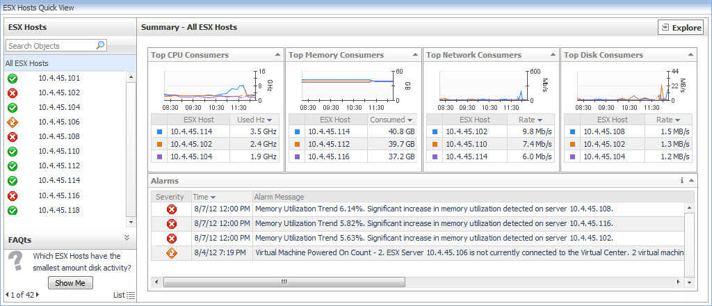 The Quick-View displays summary information about the objects you select from the Virtual Environment Overview, which is also available on the Virtual Environment Summary dashboard.