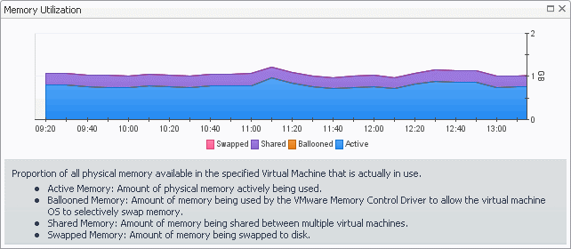 Memory Utilization, Utilization. The percentage of memory used by the virtual machine during the selected time period.