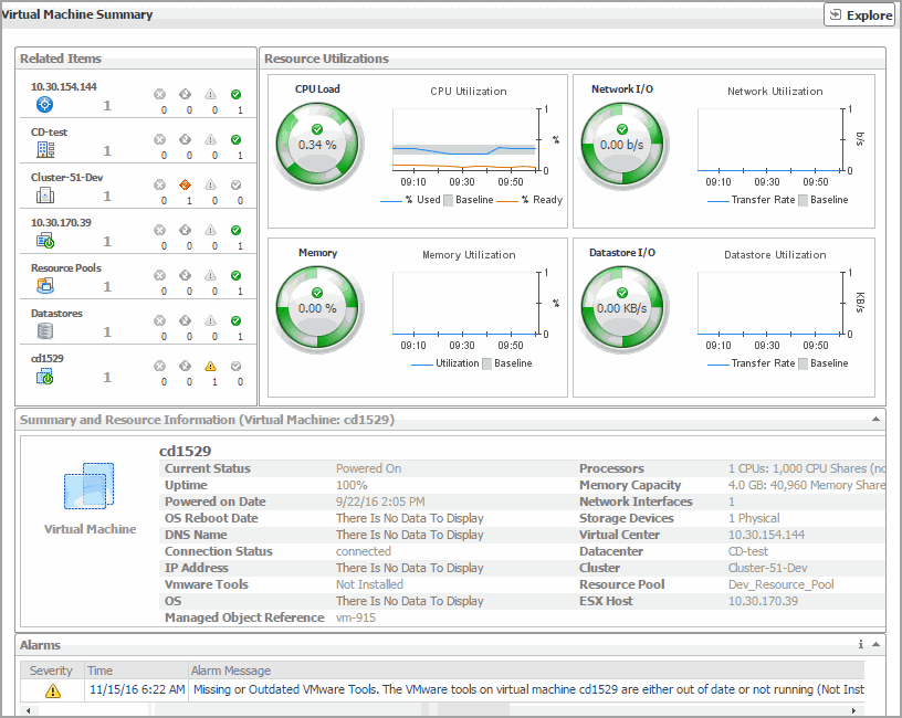 Resource Pools. The number of resource pools that are associated with the selected virtual machine, followed by the related alarm counts.
