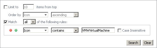 To search on a Foglight for VMware object name, select Match all of the following rules, and in the Icon box below, type a full or partial name of the object you want to search for, and then click Search. The Alarms List refreshes, showing only those alarms that are generated against the specified object type. For a list of icons and the related object names, see Virtual Infrastructure View Object Icons .