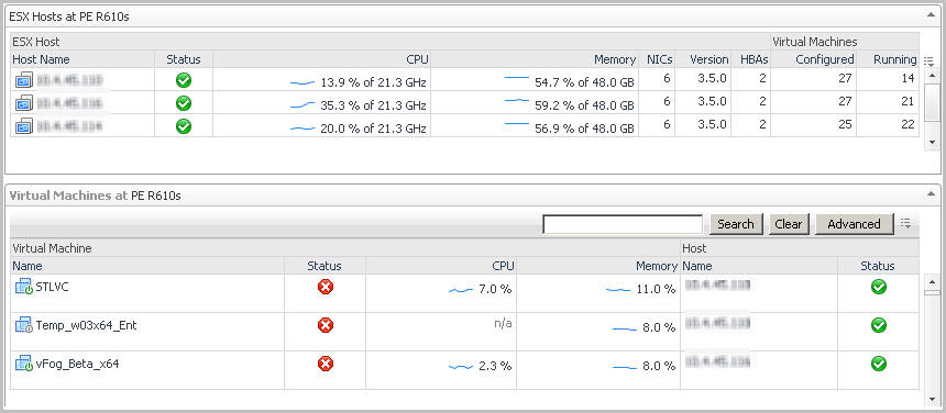 In the example below, the ESX Hosts tile is selected. The ESX Hosts view is populated with all monitored ESX Hosts regardless of their alarm state. Summary information for those ESX Hosts appears in the ESX Host Summary view.