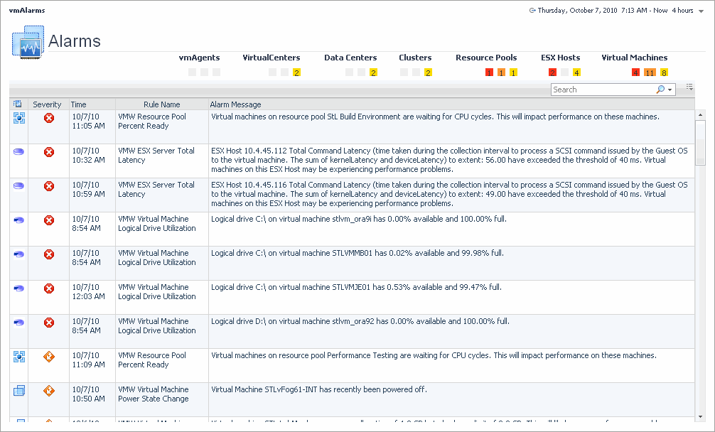 The vmAlarms dashboard provides some filtering controls. Use it to isolate alarms related to a specific bottleneck or issue in your virtual environment. The Search box appears in the top-right corner of the alarm list.