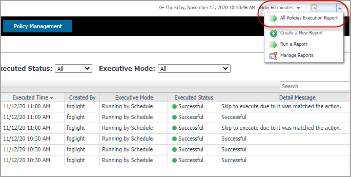 Click Reports on the top right corner of the interface and choose All Polices Execution Report. An All Polices Execution Report dialog box will appear. Fill in required information to run the report.