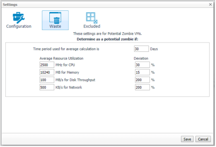 The Waste tab allows you to configure the settings for determining resources wasted in your environment. These include powered-off instances, and potential zombie VMs: