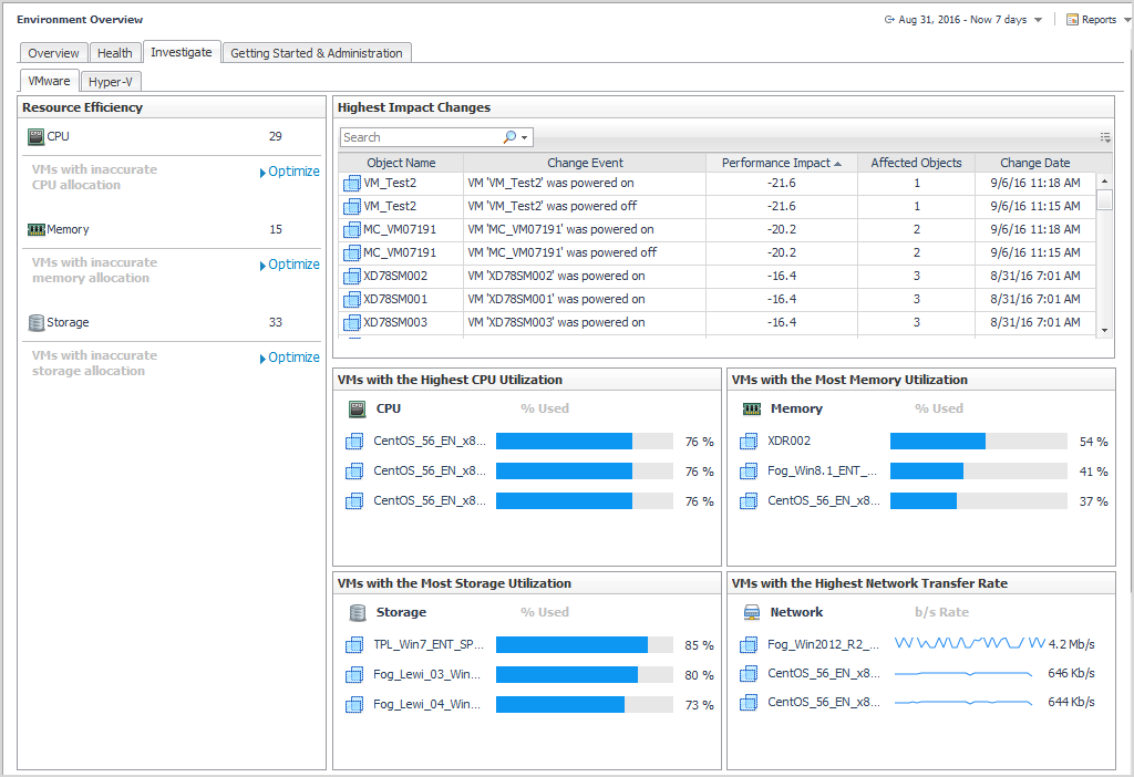 In Foglight for Virtualization, Enterprise Edition systems, the Environment Overview dashboard > Investigate tab provides a quick way to investigate the resource efficiency in your environment and to optimize VMs with incorrect resource allocations, as necessary.