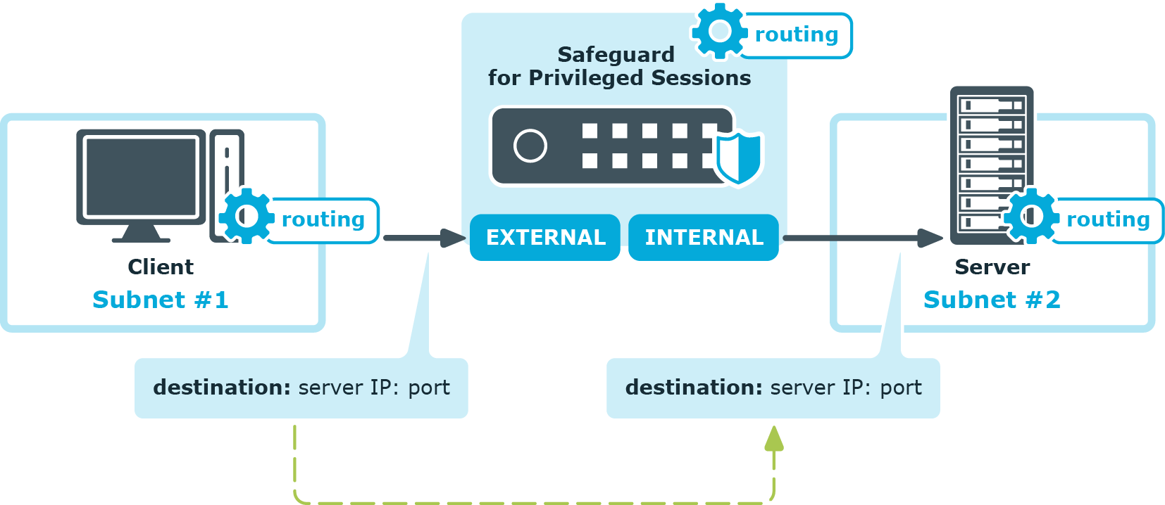The One Identity Safeguard for Privileged Sessions connection policies can work in different network models to make it easy to integrate it into an existing network. These two modes are transparent, and non-transparent modes (for details on modes of operation, see "Modes of operation" in the Administration Guide). The aim is usually the transparent implementation. Although the non-transparent mode can provide some transparency, it is not the best to be used for that purpose.