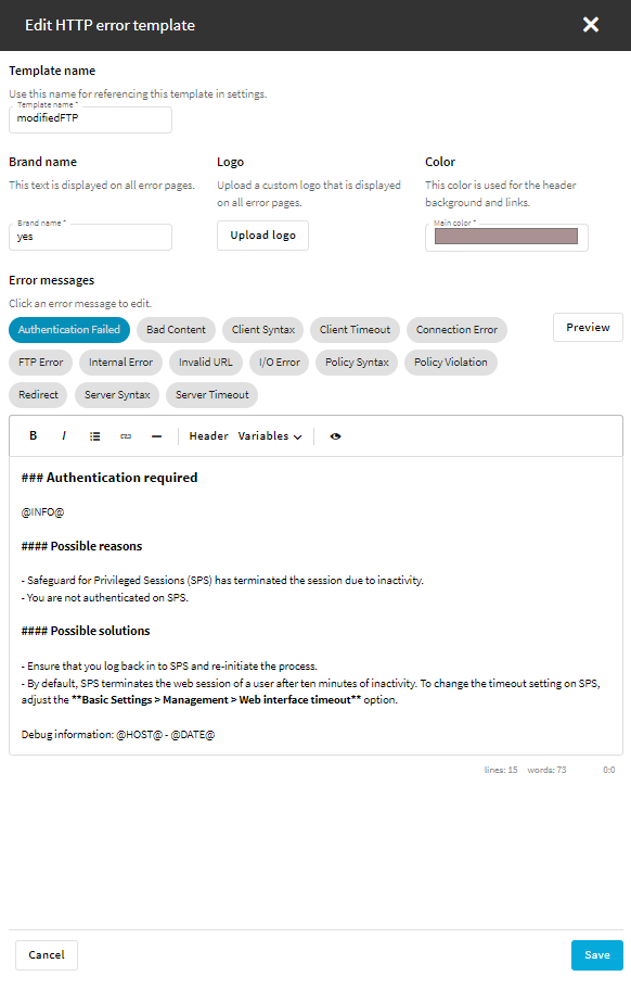 Select or modify the brand name, the color, and optionally the logo that is displayed on the customized HTTP error pages.