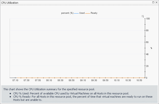 If you open the VMs tab for that same resource pool, the Utilizations view displays one graph illustrating the percent-used and percent-ready CPU utilization for the virtual machines of the resource pool.