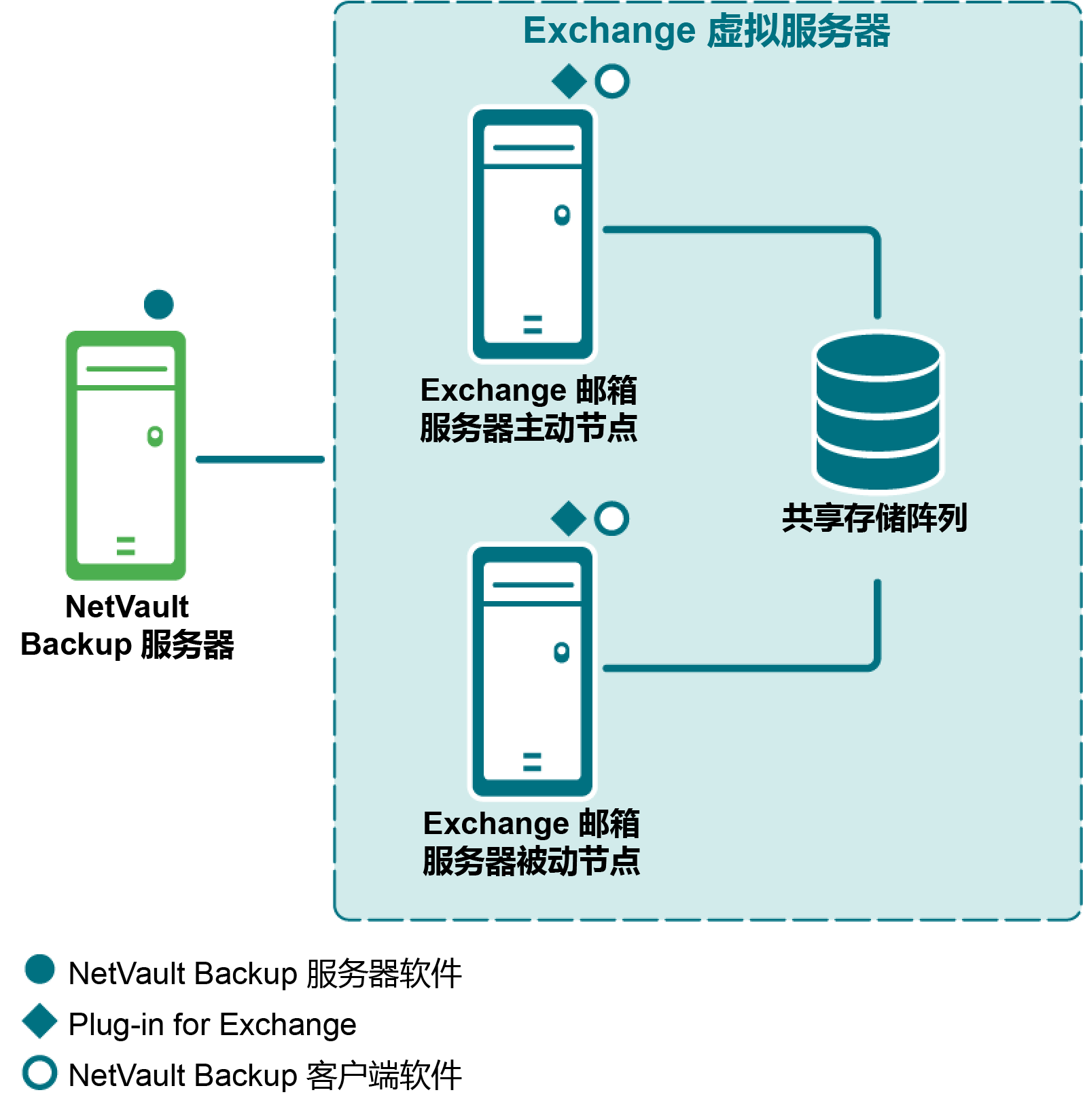 在 SCC 部署中,该插件安装在 Exchange 虚拟服务器上。Exchange 虚拟服务器是组成群集的一组节点和主机。NetVault Backup 服务器将群集视为单个客户端,称为虚拟客户端。在虚拟服务器上安装 Plug‑in for Exchange 时,通过使用 NetVault Backup 的群集支持可将插件安装在所有节点上。NetVault Backup 的虚拟客户端用于备份单个群集资源,在此示例中是 Exchange 虚拟服务器。