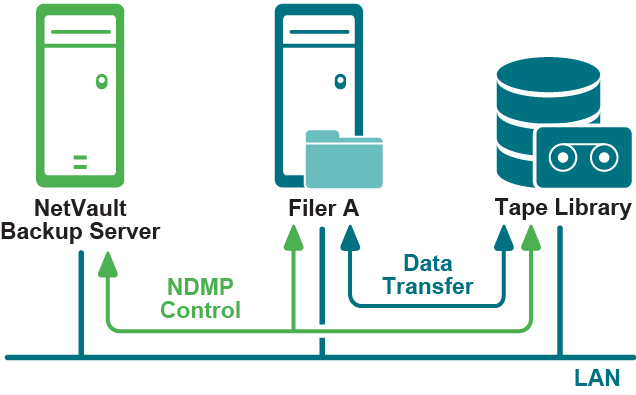 Le modèle de sauvegardes NDMP entre trois entités hétérogènes est semblable au modèle de sauvegarde en attachement direct, excepté que, dans ce modèle, les machines NetVault Backup sur le réseau utilisent également le périphérique à bandes attaché à l'utilisateur organisé pour les sauvegardes et restaurations.
