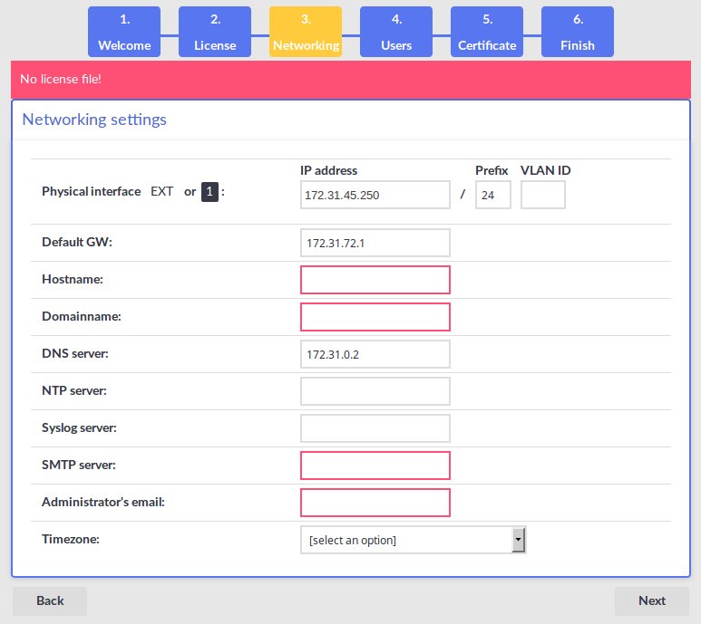 The SPS welcome wizard automatically preloads the IP address, Prefix, Default GW and DNS server fields as shown in the image below.