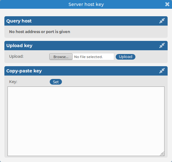 6. Click Query to download the host key of the server, or upload or paste the host key manually. SSB will compare the host key shown by the server to this key, and connect only if the two keys are identical.