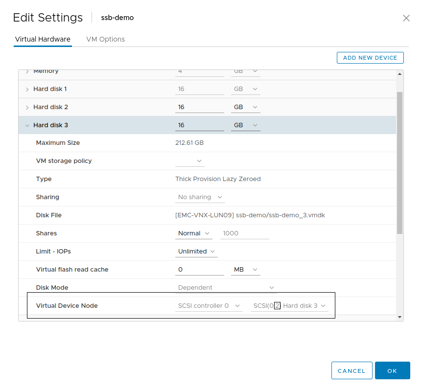 Figure 11: Log > Disks > <your-custom-data-disk> — Data disk information for your newly added custom cloud service provider data disks (VMware ESXi)