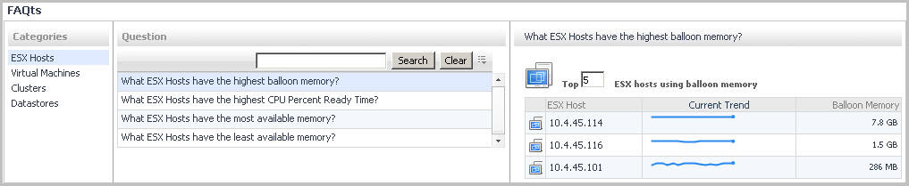Through three embedded views (the Categories, Question, and Answer views), the FAQts tab enables you to ask Foglight for VMware questions and provides the answers to those questions.