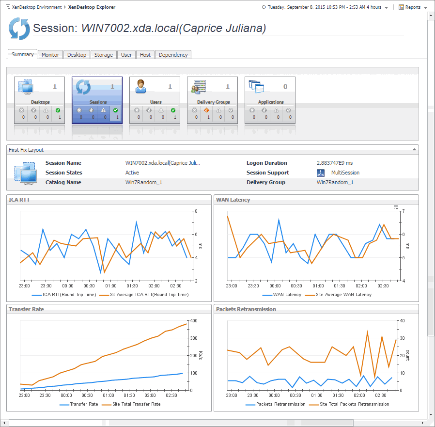 When an end user obtains access to a virtual desktop, this results in a desktop session. A session is a specific instance of an end user’s activity. For those desktops that are monitored by NetScaler agents, you can monitor their sessions. To do that, select the Sessions tile on the XenDesktop Environment dashboard. The information appearing in the XenDesktop Session Quick View can help you discover potential resource-level issues such as high session counts, and to reallocate resources where they are most needed.