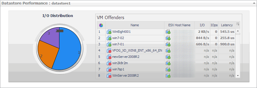 | Identifies potential virtual machine offenders that consume the highest amounts of the selected datastore resources. It also displays a pie chart indicating how much the virtual machines associated with the selected datastore contribute to the overall I/O. For each identified virtual machine, it shows its name, the ESX® host on which it is running, the disk transfer rate, the rate of I/O operations per second, and the average time that passes between the time the virtual machine issues and executes disk read or write operations. |