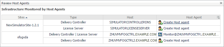 | • | Review Host Agents: Review the list of the hosts associated with the monitored XenDesktop sites in the Review Host Agents dialog box that appears when you click this link. |
