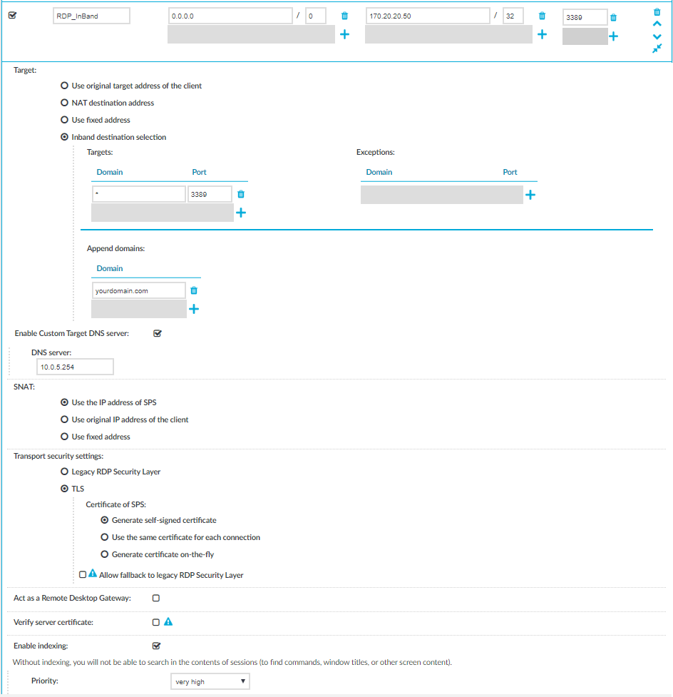 6. To use inband destination selection with RDP connections without using SPS as a Remote Desktop Gateway, you must use SSL-encrypted RDP connections.