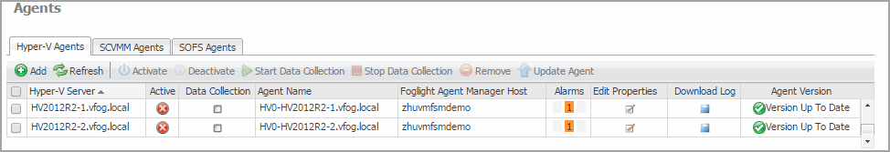 When Hyper-V, SCVMM, and SOFS agent packages are successfully deployed, you can create agent instances, activate them, and start their data collection. To perform these steps in a single operation for one or more monitored hosts, use the Agents area on the Hyper-V Configuration dashboard.