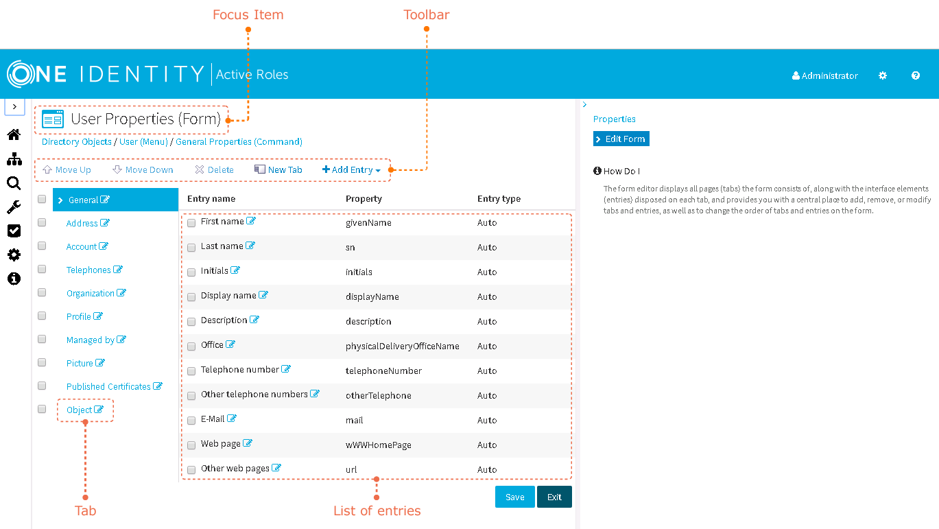 An entry is a group of elements on a form that are intended to view or modify a property of an object. For example, the First name entry is used to manage the value of the givenName property. You can add or remove entries from a form, and change the order of entries.