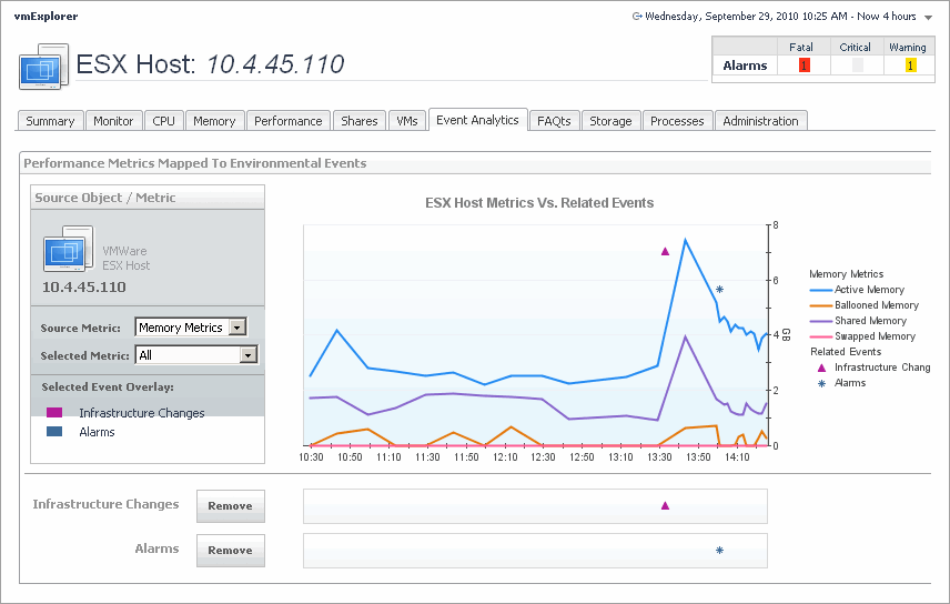 Alarms. If any alarms are generated against the selected ESX host during the selected time period, and are added as an overlay to the chart using the Infrastructure Changes and Alarms view, they also appear in the chart.