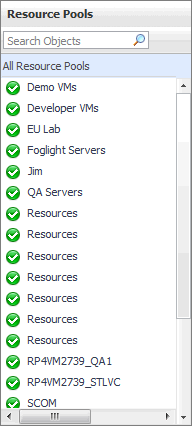 Resource Pools. Displays the Resource Pools Inventory dwell, showing the names and states of all clusters that belong to the selected virtual center. |