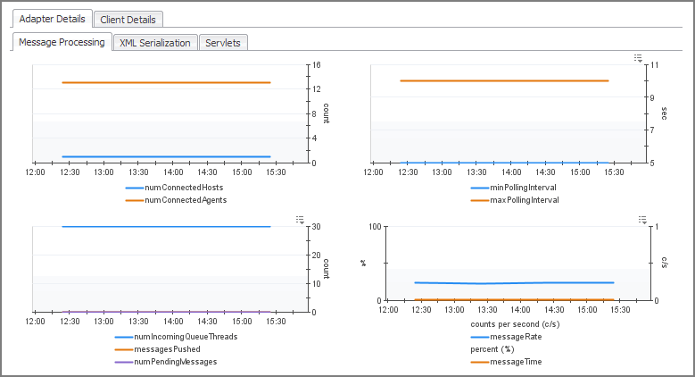 The Message Processing tab contains graphs that tell you how well the adapter is handling incoming messages. It displays the numbers of connected hosts and agents, the number of incoming queue threads, and the numbers of pushed and pending messages over time. It also shows the minimum and maximum polling intervals, the rate of incoming messages, and the percentage of time the adapter spends on message processing.