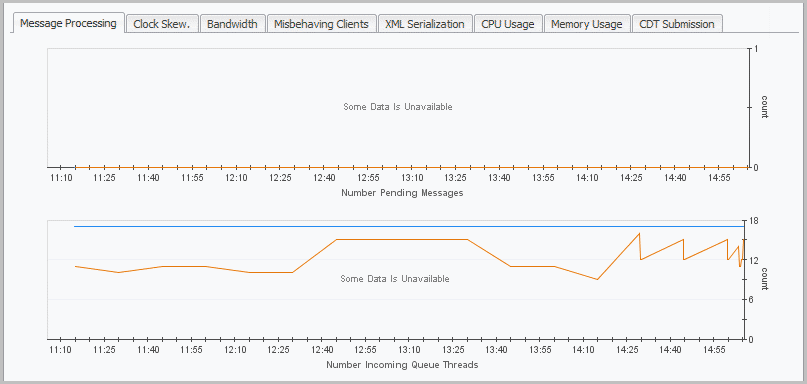 The Message Processing tab shows tables for the number of pending messages and the number of incoming queue threads for a selected Agent Manager instance.