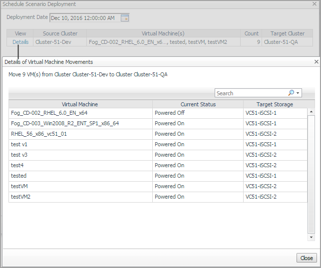 (Optional) In the Schedule Scenario Deployment dialog box, click Details to view details of Virtual Machine Movements. Click Close and return to the Schedule Scenario Deployment dialog box. |