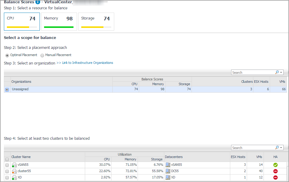 Optimal Placement: algorithm that calculates and recommends the optimal distribution of virtual machines across clusters. |