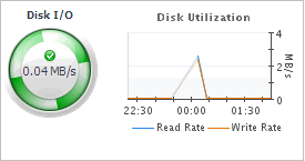 | The Disk I/O spinner indicates the rate at which the selected virtual center currently reads data from and writes to disk. The Read Rate line in the Disk Utilization chart represents the rate at which the selected virtual center reads data from the disk during the selected time period. Write Rate displays the rate at which the selected virtual center writes data to disk. | ||