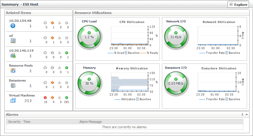 | The Network I/O spinner indicates the rate at which the selected ESX host currently reads data from and writes to the network. The Transfer Rate line in the Network Utilization chart represents the rate at which the selected virtual center transfers data from and to the network during the selected time period. The Baseline area in the chart indicates the expected network utilization range based on historical data. | ||