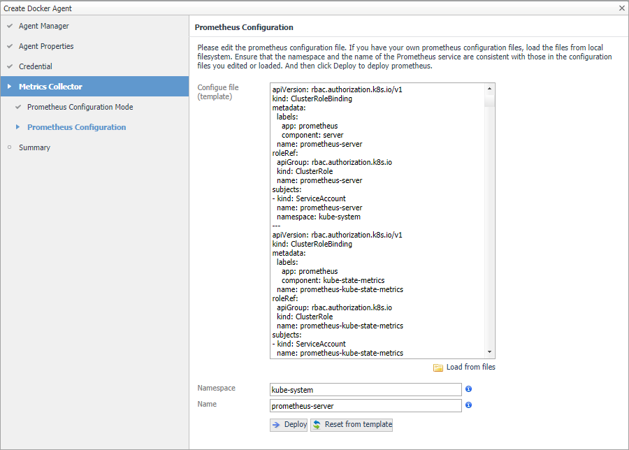 NOTE: Whenever you change the content in Configure file (template), ensure that the Namespace and Name fields are consistent with the Prometheus service configurations in your Configure file (template). If you are using the default template, there is no need to change anything. For a full version of the default template, see https://github.com/Foglight/Container/tree/master/prometheus |