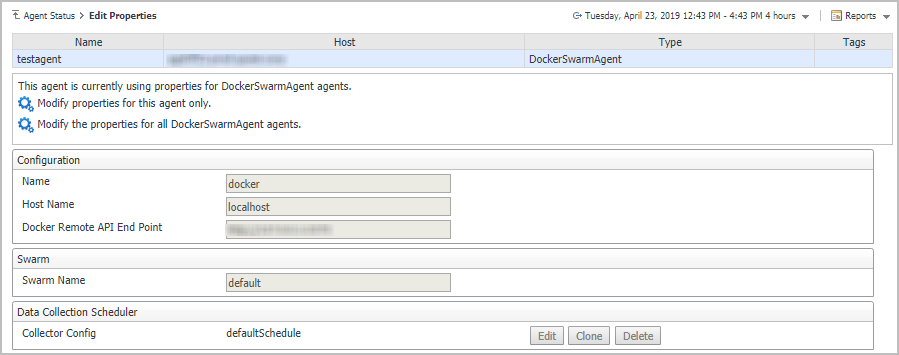 On the Agents table, select the Docker Swarm Agent that you create, click Edit Properties, and then click Modify the private properties for this agent. |