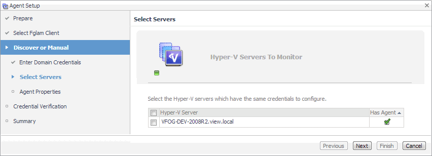 Discovering Hyper-V Servers only. On the Enter Domain Credentials page that appears, specify the information needed to search for the running Hyper-V Servers. |