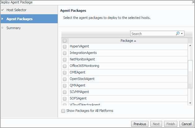 In the Deploy Agent Package wizard, on the Agent Packages page, select the HyperVAgent, SCVMMAgent,and SOFSAgent packages, and then click Next. |