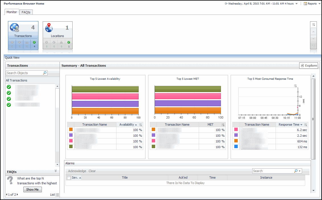 The Summary - All Transaction view displays overall response and availability information for the monitored transactions. It also identifies the transactions with the lowest availability, lowest MET (met expected time), and highest response time, showing the top five transactions in each of these categories.