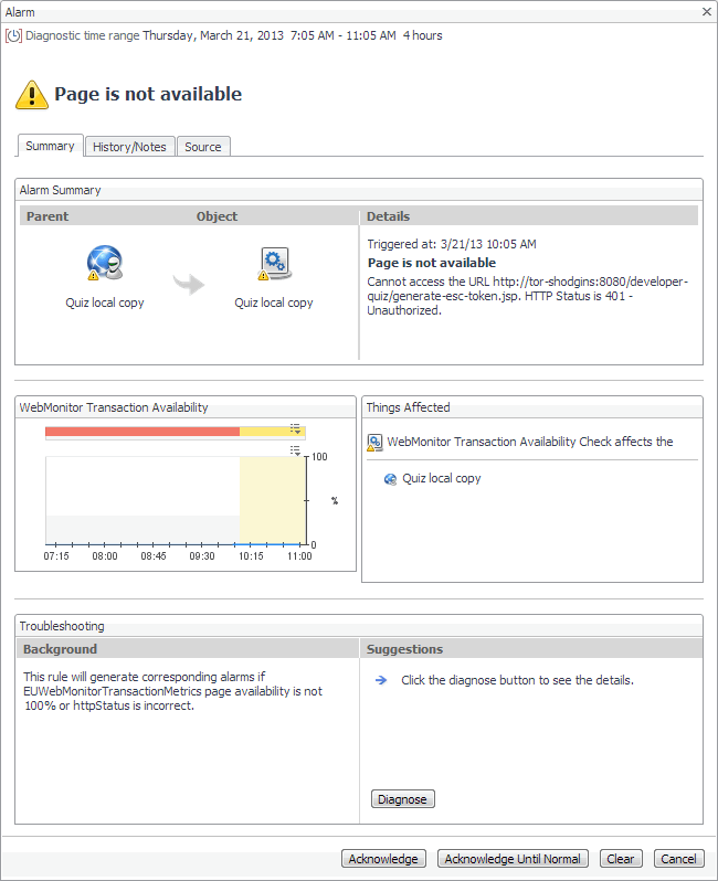 The Location view displays overall response and availability information for the transactions monitored from the selected location. It also identifies the transactions with the lowest availability, lowest MET (met expected time), and highest response time, showing the top five transactions in each of these categories. Use this view to identify the Web sites with degraded performance, and to perform further investigation.