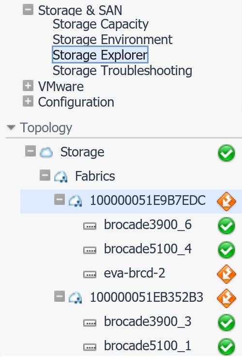 This walkthrough describes how to open the Storage Explorer and select a storage device. If you select a top-level device type node, such as Fabrics, the Storage Environment quick view is displayed. For more information about the quick view, see Summary and Resource Information for each Collected Target:.