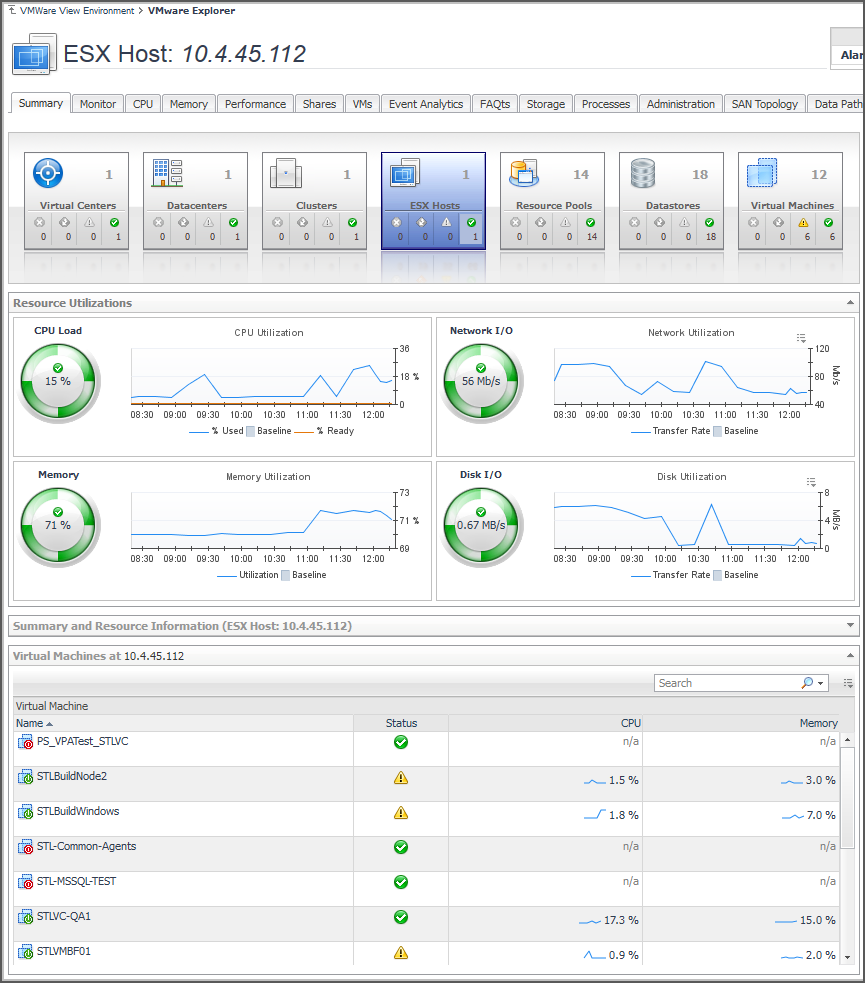 The following image shows a Utilizations view for a collection of ESX Server objects.