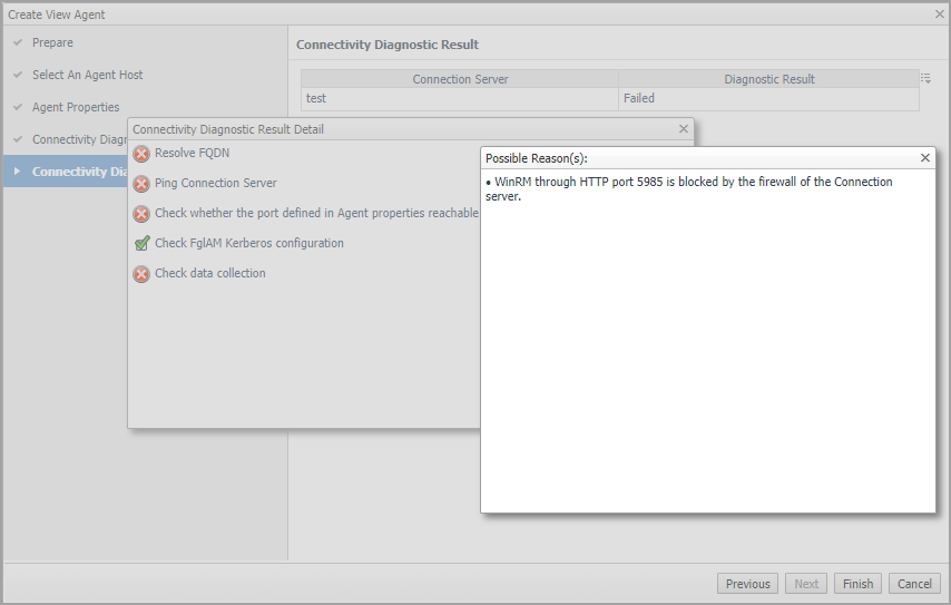 Wait for a few seconds until the Connectivity Diagnostic Result page appears. Click the Diagnostic Result and the Connectivity Diagnostic Result Detail page appears. Click on the failed items to see the possible reasons. |