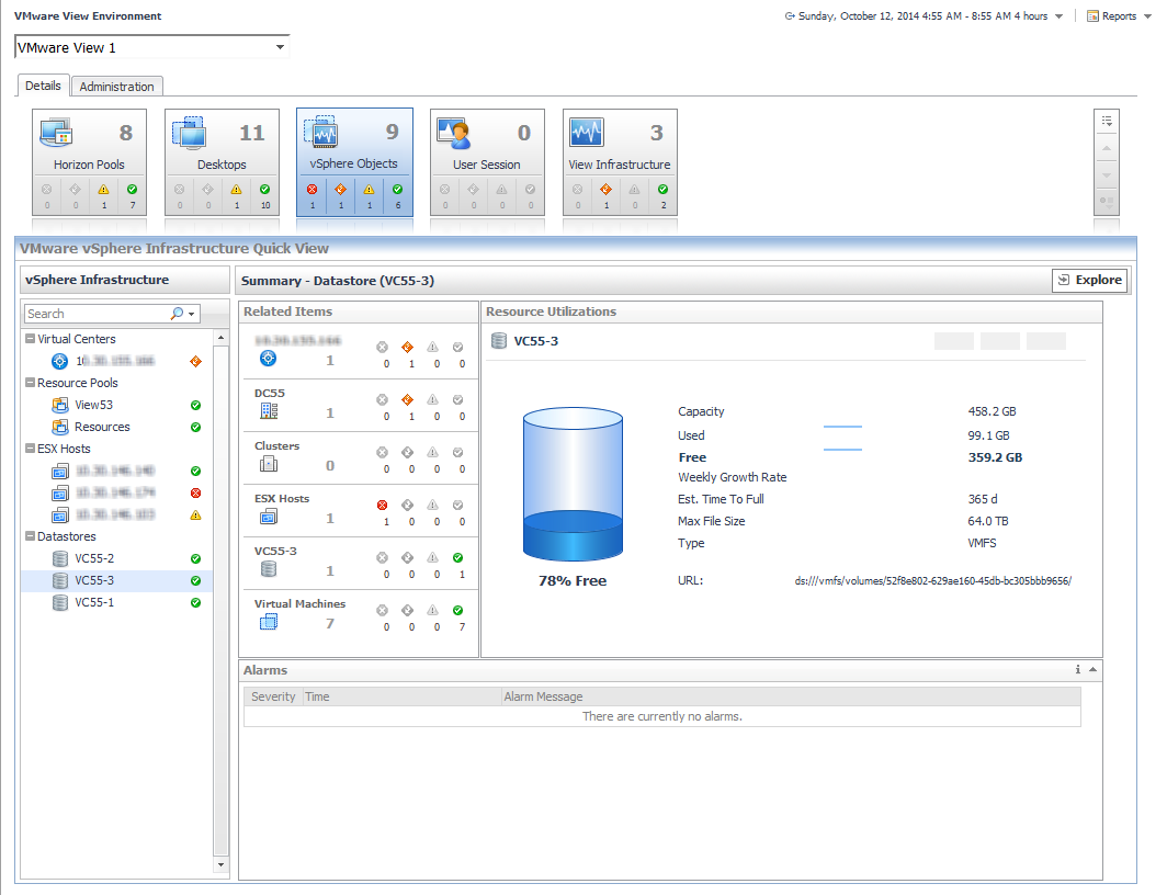 Clicking the label in the tile, for example, vSphere Objects, displays summary and alarm information for all components of that type in the Quick View area.