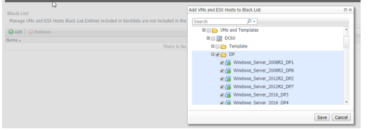In the Add VMs and ESX Hosts to Black List Dialog, choose the VMs and ESX hosts need to add to black list, and then click Save. The page will be redirected to the Black List table view and show all the VMs and ESX Hosts which are in the black list. |