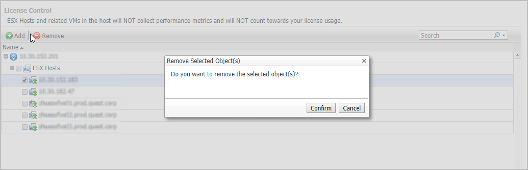 The License Control tab is used to manage license usage for ESX Hosts. The ESX Hosts and related VMs in the host added to the license control list will not collect performance metrics and will not count towards license usage.